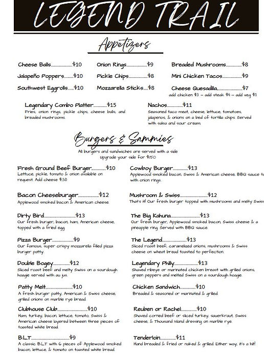 All info on Legend Trail Golf Club in Scottsdale - Call to book a table. Legend Trail serves Parkersburg Iowa and surrounding communities with quality golfing for all ages and skill levels special event hosting full-service dining at the clubhouse restaurant and. The actual menu of the Legend Trail Golf Club.